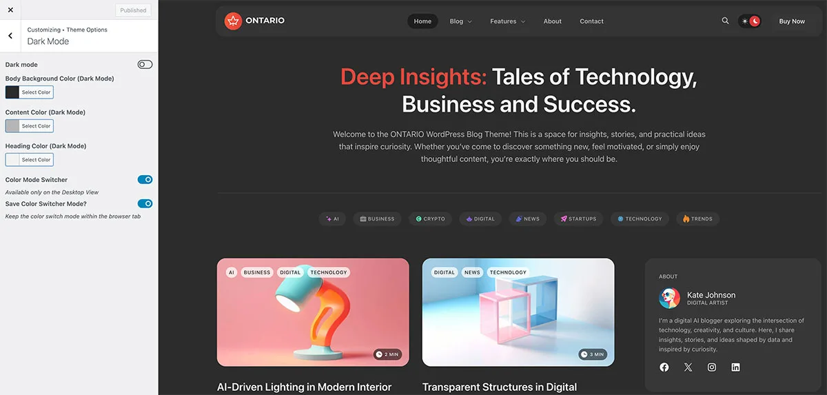 General InformationHow to Install ThemeTheme ActivationHow to Update ThemeImport Demo ContentFront Page SetupWPDaddy Header & Footer BuilderValidate Header & FooterHow to Edit HeaderHow to Edit FooterSelect Area for Header & FooterHow to Assign Header & FooterHow to Enable Sticky MenuMega Menu Color Mode SwitcherPage OptionsCustom SidebarsPage PreloaderNavigator in ElementorCustom Post TypesCustom PermalinksTranslation SupportMobile IssuesSupport DeskLicense TermsChangelog 15.Color Mode Switcher You can activate the skin mode option in Customizer -> Theme Options -> Dark mode section. You want to keep the selected color during the entire session while browsing the website, please activate “Save Color Switcher Mode” « Mega Menu Page Options » Suggest Edit Captcha : Submit